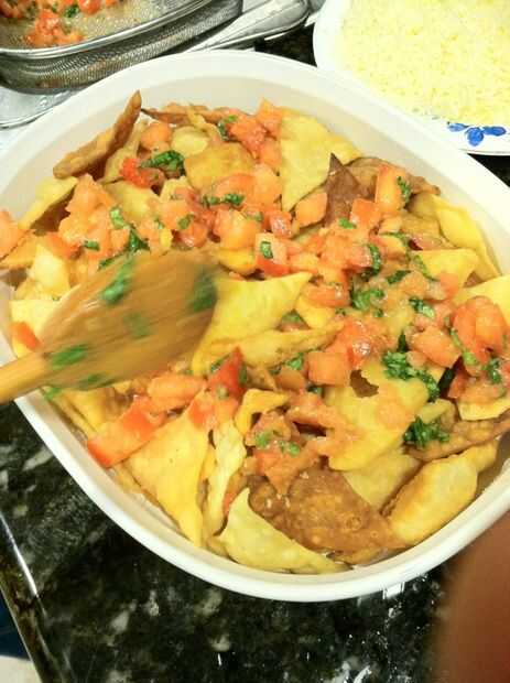 Cucharada de tomate albahaca mezcla fuera del tazón de fuente y drenar el exceso de humedad. (Demasiada humedad hará que las virutas empapado)