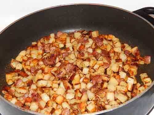 Cortar las patatas rojas en cubo y Precaliente una sartén de aceite y marrón y cocinar las papas por unos 5 a 10 minutos. Cuando son marrón y crujiente, apáguelos y drenaje y cool.