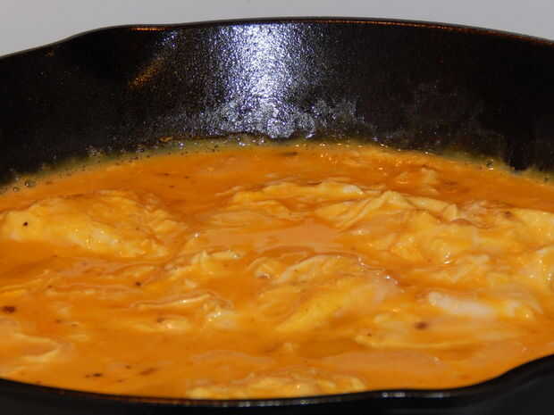 Inicio de grieta 12 huevos en un bol. Batir los huevos. Condimentar el huevo con sal y pimienta. Puede usar cualquier condimento que le da. Batir los huevos y añadirlos en la sartén para que pueda llegar a revolver los huevos. Deje enfriar de huevos después de la cocción.
