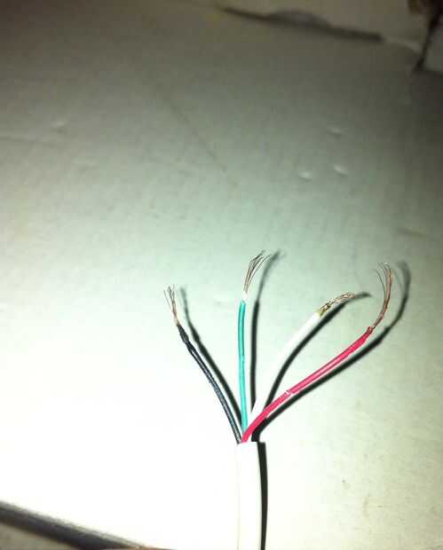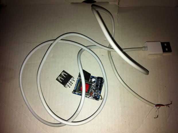 Conseguir su cable cargador viejo y corte del extremo que va en iPhone y pelar hacia fuera cuatro cables (rojos y negros para la energía, verde y blanco para información)