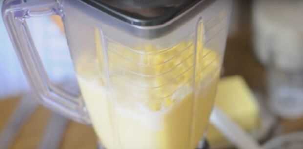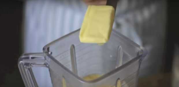 Después de licuar hasta los elementos, añadir la mantequilla y un poco más para unir. Aún con los elementos en la licuadora agregar los huevos y continuar el proceso de licuefacción.