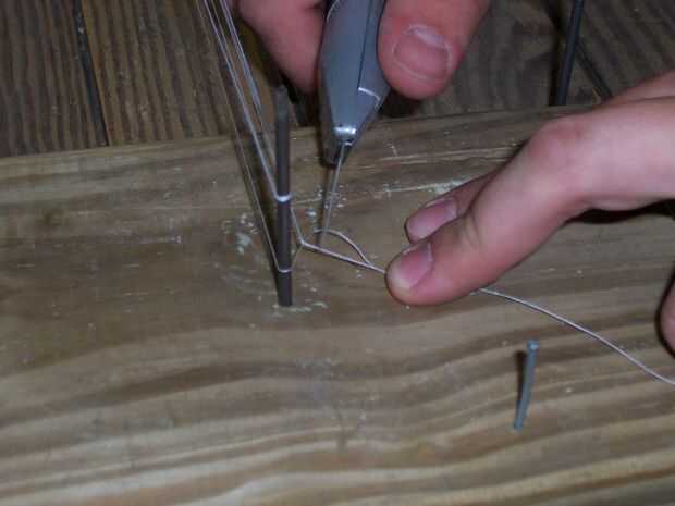 Lazo de cuerda alrededor de gancho y clavo grande cuatro veces.