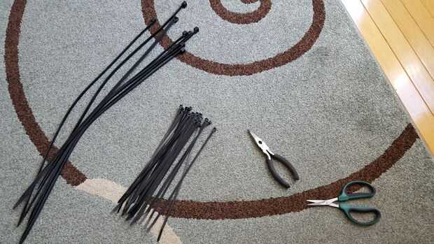 Para mi construir esto igualó seis lazos zip largo en total, con seis pequeñas ataduras de cremallera por amarra larga, 36 lazos zip pequeño en total del mismo.