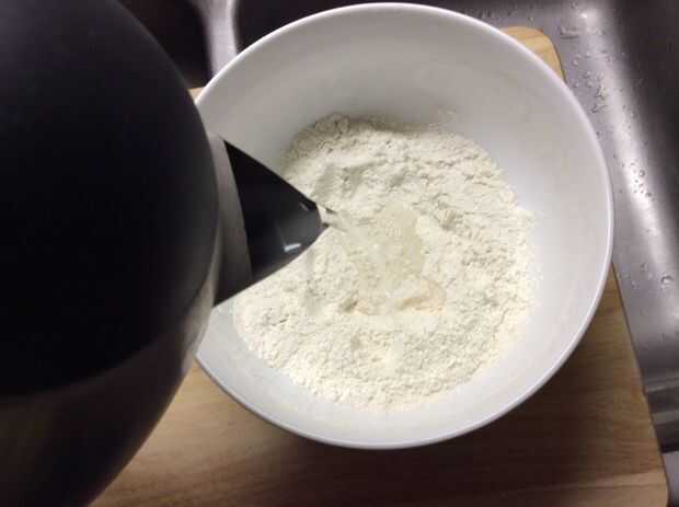 - Consejos: La imagen mostrada aquí es para mostrar que te gusta cómo ven al verter el agua sobre la harina. Para el cocinero sin experiencia, asegúrese de poner el agua a una taza y Vierta lentamente y con cuidado para evitar verter demasiada agua.