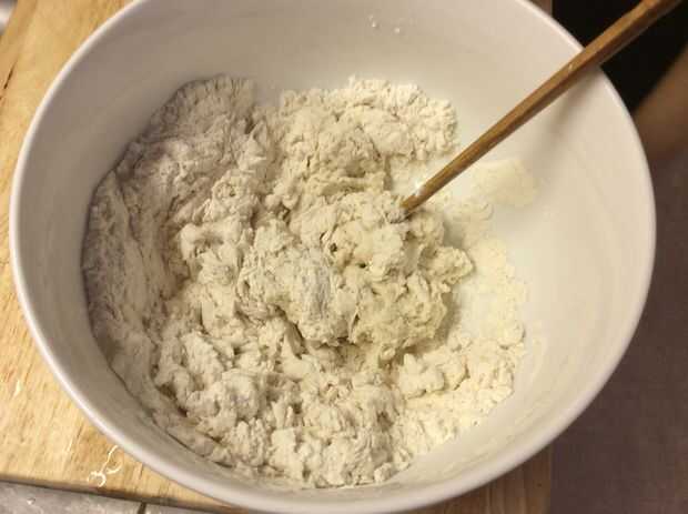5. Continúe removiendo la harina hasta que la bola de masa comienza a salir de los lados del tazón de fuente.