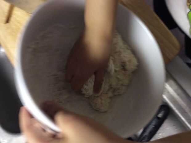 10. volcar la masa, doblarla y empuje hacia abajo otra vez.