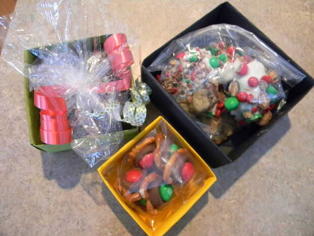 Yo solo empaquetado encima de las galletas y mordeduras Navidad Crunch en zip cierre bolsas. I forrada la caja media con Syran abrigo y envuelto para arriba y alrededor de bolas de pastel y asegurado con cinta.