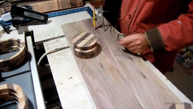 Para perforar los agujeros en las piezas de las tapas y los fondos y luego corte los círculos así como en la Sierra de cinta. Y por supuesto tengo más anillos de caja para cortar, así que sigo cortando.