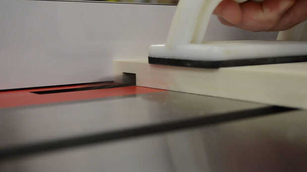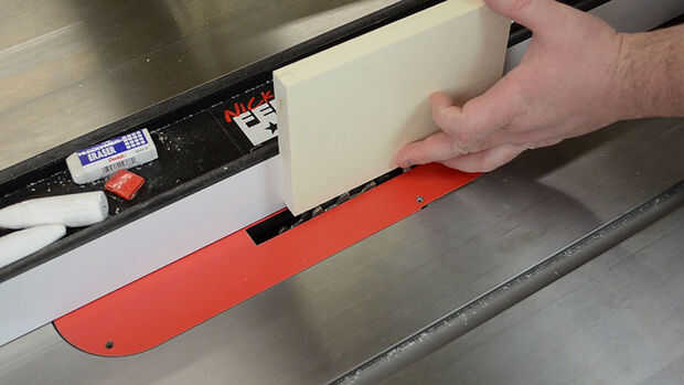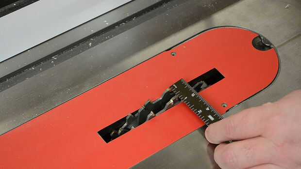 Cambiar la hoja de ranurar a exactamente 1/2 del espesor de material. En mi caso es 3/8". Usar su material para establecer la distancia de la valla en la hoja de ranurar. El lado izquierdo de la hoja debe quedar al ras con el espesor del material. Seguir adelante y hacer los cortes en los extremos restantes de cada una de las piezas laterales.