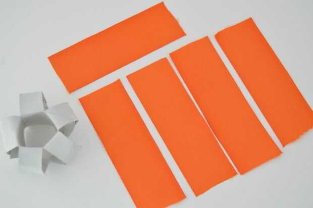 Mida y corte la cinta de tal manera que debe ir una pulgada dentro del rodillo en la parte superior e inferior para fijarlo con el pegamento. Cortar tantas tiras como sea necesario. Utilicé tiras de 7 para hacer esta calabaza.
