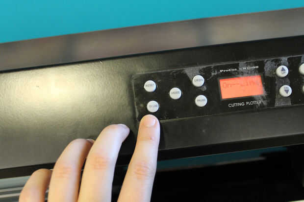 Ir al panel de interfaz con el cortador de vinilo.  Establecer la ubicación de origen.  Para hacer esto en nuestra máquina, usted seleccione fuera de línea (pulse el botón de "en línea" hasta que aparezca la x y y coordenadas.  El botón en línea le permite alternar entre online y offline).  Los botones izquierdos y derecha mover la cuchilla.  El arriba y abajo los botones de mover el vinilo hacia adelante y hacia atrás.  Una vez que la hoja en la parte superior de la pieza, presione el botón de "Origen".  Presione otra vez "En línea" y esto le hará este nuevo origen.