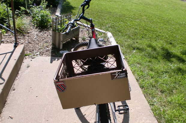 Quería kit de una caja de herramientas de buen tamaño para cargar las herramientas y los proyectos de mi makerspace local. Utilicé una correa accesorio colocada alrededor de mi poste del asiento y la palanca de la caja de herramientas para impedir el
