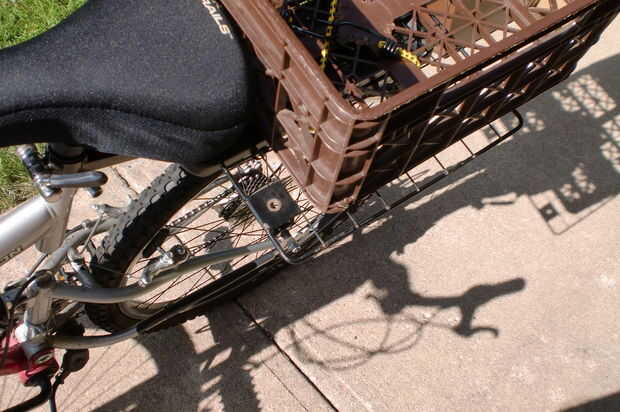 He añadido algunas fotos de mi bebé ;) Sí, es una doble suspensión con un bastidor trasero. Es uno de los estantes va alrededor del poste de asiento, en vez de hasta las punteras. Yo zip ligado el estante más grande (se muestra en la foto #5) a él, y el cajón de la leche es bungee con cable de red a la que.