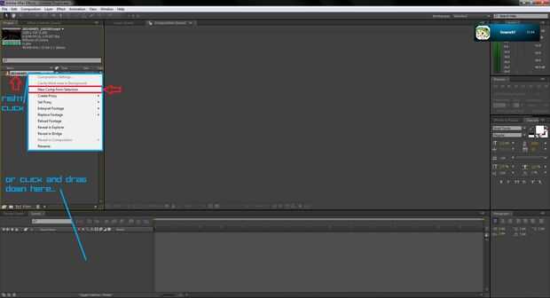 3.) puede haga clic derecho en material de archivo, seleccionar "Nuevo Comp de selección" o arrastre de material de archivo en la línea de tiempo.