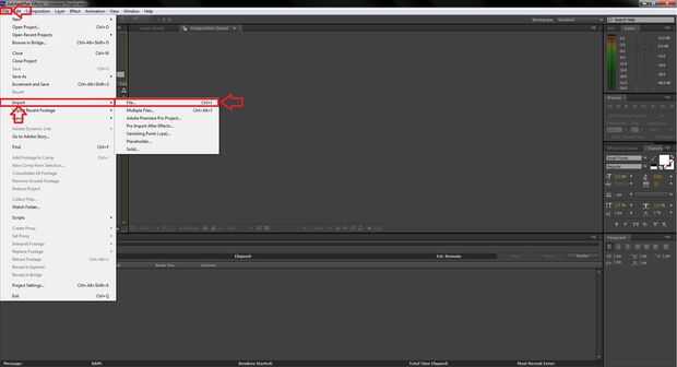 1.) cuando se abren After Effects puede importar material de archivo haciendo clic en archivo > Importar > archivo...