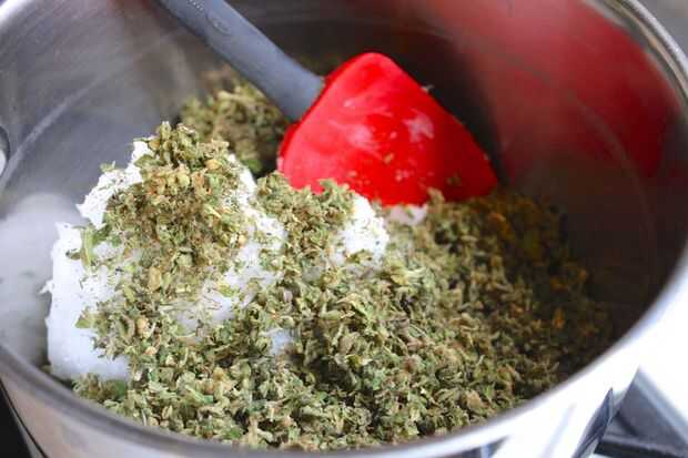 Combinan el cannabis y el aceite de coco en una cacerola pequeña sobre el calor más bajo que usted puede manejar.