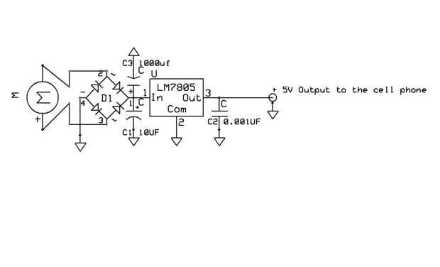 Si usted no quiere fijar el motor solo agarrar tu moto y pasar a una moto en el taller de reparación y estoy seguro que pueden fácilmente arreglar el motor fácilmente si va a hacer a usted mismo la mejor manera de hacerlo es mediante la soldadura del motor en la moto y coge un papel de lija y arena hasta que se convierte en liso y pintar las juntas de soldadura para hacer su bicicleta y el motor se parecen. la otra forma es agarrar algunas bandas de metal y la tuerca y tornillos así que de alguna manera puede firmemente lo bueno no te puedo decir brevemente porque depende de modelo de su bicicleta (la que he usado es buena moto es decir es potente y pesado a diferencia de los ciclos pequeños y de moderno también tenía uno o dos de ellos pero no son lo suficientemente potentes con respecto a éste). y diferentes maneras se pueden utilizar para solucionarlo. Eso es todo que puedo decir de fijación del motor...! Ahora wen haya terminado con el motor de la fijación tiempo de alambre si está usando una marca solo motor AC que está trabajando y tiene muchos terminales o cables viene de aguantan el motor y elegir cualquier dos terminales y lamer esos dos cables y girar del eje del motor lentamente hasta que sienta la corriente este es uno de lo método más rápido de la prueba y no es peligrosa hasta que usted gire el motor eje muy rápido (ahora no te confunda que sólo debes elegir cualquiera de las dos y continuar hasta obtener resultados positivos que es hasta que usted sienta la corriente). Ahora ya tienes las terminales sólo tiene que conectar dos cables con él para que el centro de poder no necesita estar demasiado cerca al motor ahora aquí viene la parte de electrónica. Ahora tienes que construir un simple circuito circuito y ponerlo en una caja. El circuito se da en la imagen de arriba. Si no está familiarizado con la electrónica de cualquier electricista y mostrarle este circuito que puede hacer fácilmente esto. Ahora cuando usted ha hecho el circuito poner en una caja y agarrar al conector de cargador móvil del teléfono celular tal vez usted puede conseguirlo viejo cargador de móvil o en radishack. Ahora conectar la potencia del motor a la entrada del centro de poder y no importa la potencia salida es AC o DC. Conecte la salida de 5V a la toma de entrada del teléfono y el lugar el poder concentrador donde que quieras o tal vez debajo del asiento. Aquí vas conectar la salida del cargador a su teléfono celular y empezar vendiendo abajo tú bicicleta y tu móvil comenzará mostrando la carga!