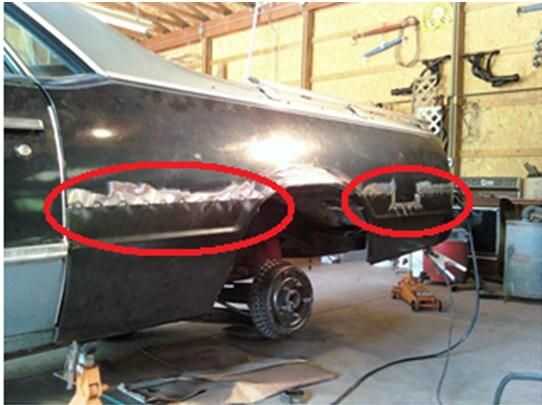 6.) vas a querer hacer esas soldaduras a lo largo del borde superior de los paneles de reemplazo. Como se muestra en el área roja en la foto (1ª imagen de abajo)