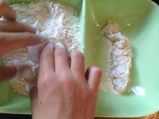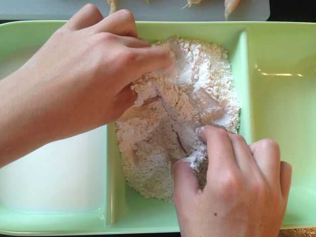 Esta parte puede obtener sucia! Tomar cada tira de pollo individuales y e introducirlo en el suero de leche, entonces en la harina con los condimentos. Colocarla en el tercer recipiente. Es vital hacer primero el suero de leche para que la harina se pega a la tira de pollo para hacer el revestimiento exterior de delicioso. También, el suero de leche ayuda hace que el pollo tiene un sabor maravilloso.