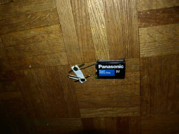 la otra chincheta toca una barra de metal que estaba conectada a la batería