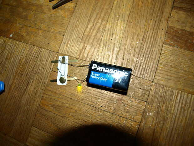 en la foto 2, el clip tocado dos chinchetas que permitió la electricidad a través de traver y llegar a la LED