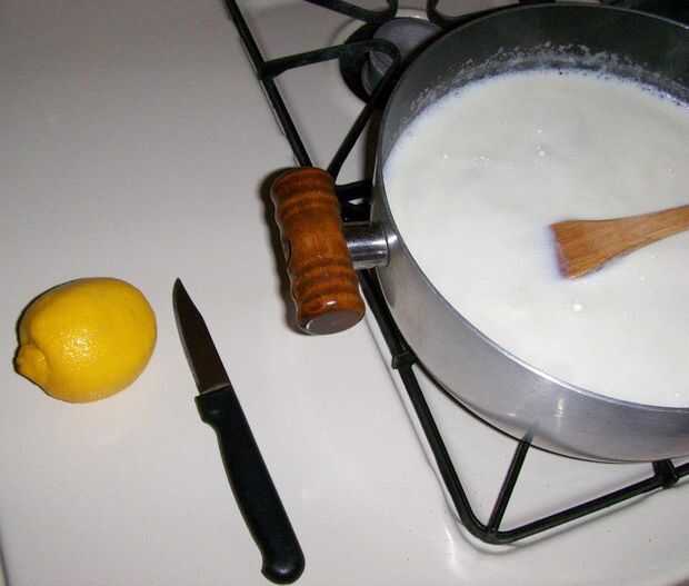 La leche ha llegado a 185 f y haber apagado el calor. Añadir el jugo de limón 1/3 taza y revuelva suavemente.