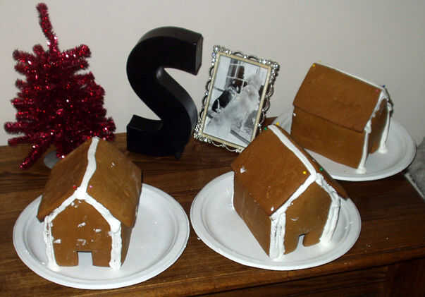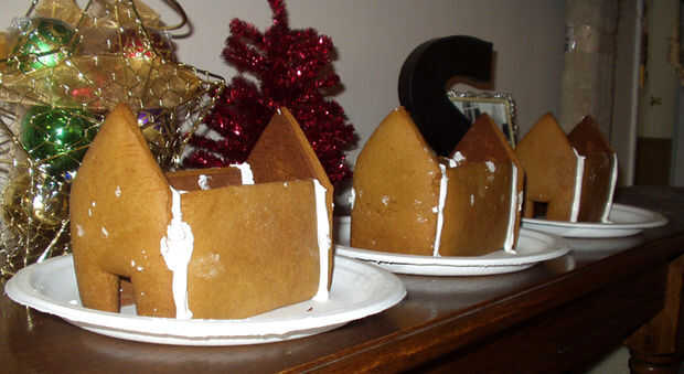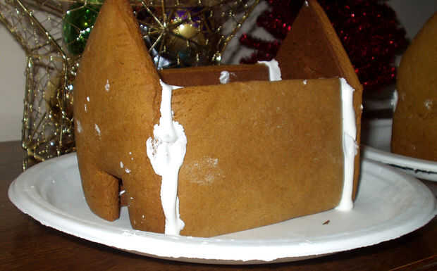 Mantenga su bolsa de pastelería con glaseado real cerca. Ahora, con los pernos rectos, ponga dos piezas verticales y los juntos. Tubo de glaseado en la costura en el interior y el exterior. Repita hasta que todas las cuatro piezas son verticales, fijado y congelado.