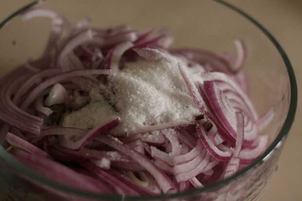 En un recipiente de vidrio, preferible con una tapa hermética, lugar en rodajas cebolla, una cucharada de azúcar y una cucharada más pequeñas de sal.
