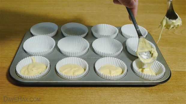 Inserte los casos de la Magdalena de papel en la bandeja y aproximadamente la mitad llénela con la mezcla de pastel. Puede utilizar casos rosa o rojos si lo prefieres.