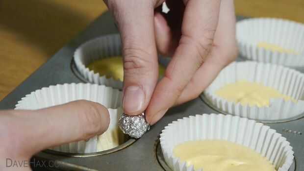 Retener la caja del papel y coloque la bola de papel de aluminio entre la lata y el caso. Hacer esto para todas sus magdalenas. Se trata de cómo forma el corazón.