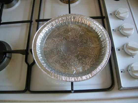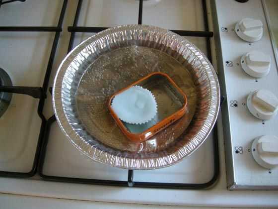 Haz tu pastel lata/maceta y llenar con agua. Ahora mida (por volumen) cuánta cera tienes. Esto será importante cuando se agrega el aceite. Conseguir el agua a hervir poner su lata de Altoids/envase en el agua hirviendo, luego poner la cera en el lata Altoids/contenedor. Empieza a derretir, baje el calor porque si lo tienes en la posición más alta se hervir lejos el agua.