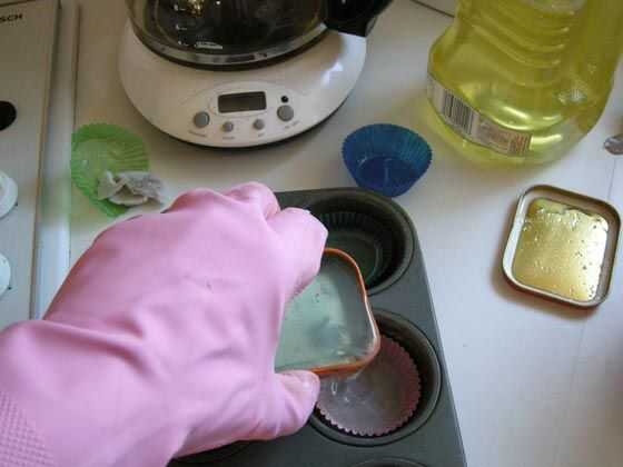 Poner las cositas de la Magdalena en la bandeja de muffins. Ahora la cera derretida y el aceite y verter en las cositas de la Magdalena. Que conjunto. Utilice el bloque de hielo Si desea.