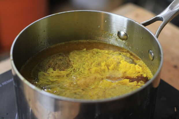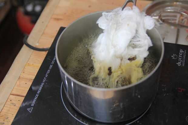 Llene una olla con agua y esperar a que empiece a hervir a fuego lento. En este punto puedes empezar a añadir el panal. Los paquetes de Gasa son bastante voluminosos inicialmente, así que empieza con la adición de un paquete en un momento y luego puede agregar más al agua en etapas como suaviza. Ahora a esperar para que el panal para romper y el agua aceitosa y amarillo.
