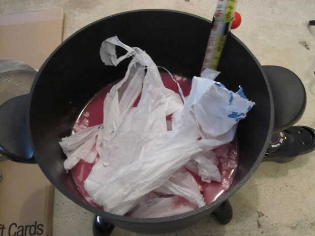 Una vez que te 300 *, comenzar a agregar las bolsas de plástico, uno por uno. Ayuda a cortar en tiras para que costumbre bola para arriba, pero no tengo ningún dato para apoyar una específica manera todavía. Más su revuelva la mezcla, se disuelven más rápido las bolsas (a no ser demasiado loco, podría introducir mucho aire en la cera). Seguir añadiendo bolsas hasta que no disuelven más. La mayoría de los plásticos debe han disuelto, dejando unos pocos trozos de izquierda. Con polietileno de baja densidad generalmente es una mezcla de 25%, mientras que los bolsos HDPE son alrededor 15%. Estancia de la paciente, este proceso puede tardar un tiempo.