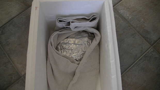 Ya que mi empresa no viene por horas y estas botas necesitan descansar, envuélvalas en papel de aluminio. Una vez envuelto herméticamente en papel de envolver en unas toallas viejas y colocar a cada bota en una hielera. Literalmente tienen todo el día. Justo antes de que mi empresa llega tiraré a las culatas. Todo está listo con no stress involucrado.