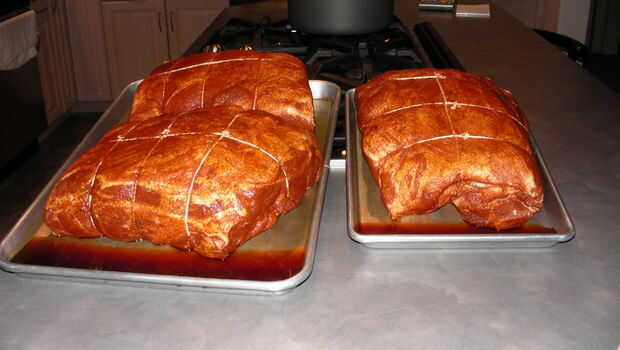 Deja la carne de cerdo en las cacerolas de la hoja y en un ángulo para que el jugo corra. Luego mueva a las culatas a otra bandeja para volver a la temporada. Una vez sazonado, deje la carne de cerdo en la encimera a temperatura ambiente mientras construyes tu fuego. (No demasiado largo aunque). Esto ayudará a acelerar el tiempo de cocción.