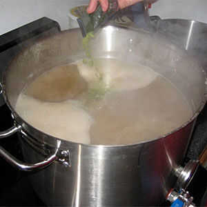 Tan pronto como se alcance un hervor agregar el lúpulo a la hierba y continuar a hervir durante 60 minutos. Agregado de lúpulo en este punto en el proceso de da cerveza su amargura, debido a los ácidos alfa que se extraen. Desde ingenio belga no terriblemente amargo, nuestra receta llama para sólo 1 onza de lúpulo de Estiria Goldings 4,8% ácido alfa (cuanto mayor sea el porcentaje de alfa ácidos más amargo del lúpulo). En la mayoría de las recetas cerveza otra adición de lúpulo se hace 2 a 5 minutos antes del final de la ebullición para dar sabor y aroma. Nuestra receta renuncia a estas adiciones, cervezas de trigo son luz en el sabor de lúpulo, pero llame para una adición de 1/2 cucharadita de jengibre y una de canela palo 5 minutos antes del final de la ebullición.
