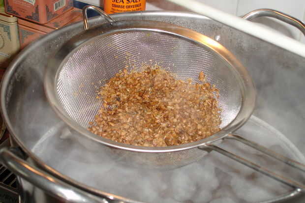 Este es el término preparación para el proceso de extracción de la bondad de los granos de la especialidad, Malta cristal en esta receta. En primer lugar Vierta 1/2 galón de agua de su botella de agua de 3 galones y coloque una marca en el nivel de agua de 2 1/2 galón. Ahora vierta hasta 2 1/2 galones de agua restante en tu olla de colar dejando por lo menos 3 pulgadas en la parte superior de la maceta. Añadir los machacado granos. Encender la calefacción a media alta y la temperatura hasta 150 a 155 grados. Apagar el fuego y tapa la olla colar para dejar la magia toma lugar dentro de 30 minutos. Use un colador para quitar tanto el grano gastado como sea posible sin preocuparse demasiado por el restante pocos granos.