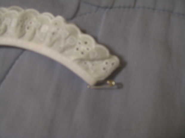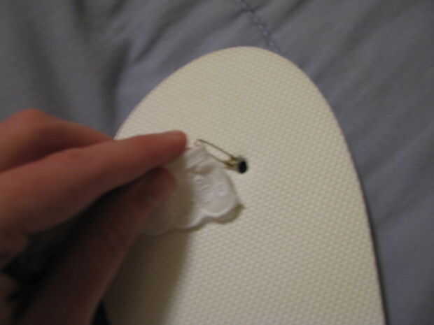 Ayuda para enhebrar el cordón por el agujero, utilice un alfiler como la aguja. También será tu ancla para el cordón. Fije el perno de seguridad a la parte más fuerte de la puntilla en su punto medio y empuje el perno a través del orificio de la parte superior del zapato a la banda de rodadura.