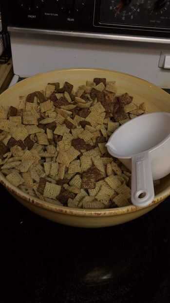 -Añadir 9 tazas de tu cereal favorito de chex a tazón de fuente grande