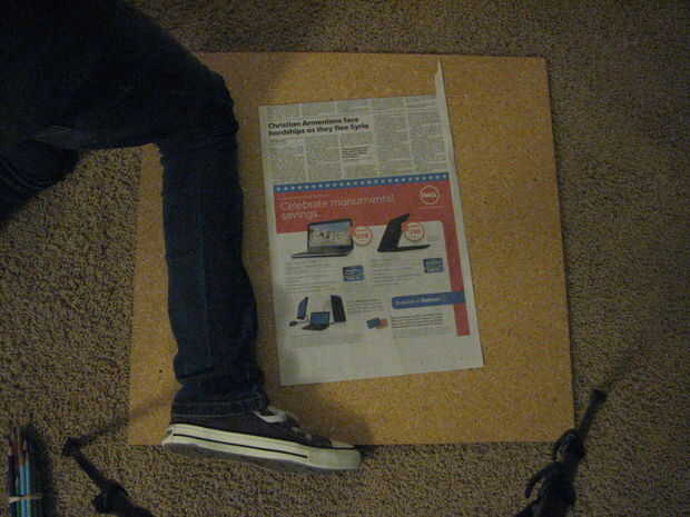 Antes de comenzar a cartón corte, necesita tener un patrón. Dibujé mi diario. Doblar el periódico por la mitad longitudinalmente. Obtener una medida de la pierna colocando el periódico doblado en su lugar de trabajo (trabajo en la planta es útil). Poner el tobillo en la parte inferior del papel y ponga una marca de lápiz en la parte superior de la rodilla. Dibujar la mitad un patrón contra el pliegue para que sea simétrica después de que ha sido cortado y desplegado. Puede ser útil buscar en línea para las ideas (forma, longitud, anchura, etc.). Tenía que dibujar mi patrón, cortarlo hacia fuera y mire en un espejo varias veces antes de que me gustó. Trace el patrón en dos piezas de cartón.