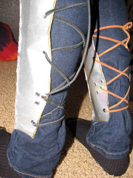 Hacer varias marcas cerca del borde en el interior en acerca de intervalos iguales. Hice cinco, ajuste para la longitud de las piernas. Para ello en cada lado de cada pieza. Perfore agujeros en cada marca. Si la perforadora tiene un ajuste de la distancia, situado a aproximadamente media pulgada. Si tu de solo no, eyeball. Ojal todos los orificios. A partir de uno de los orificios superiores, encaje en un zigzag de la manera en la parte inferior y luego volver a subir. Probar la armadura. Apriete la cincha, lazo en la parte superior. Darse varias pulgadas de piel extra en cada lado y cortar.