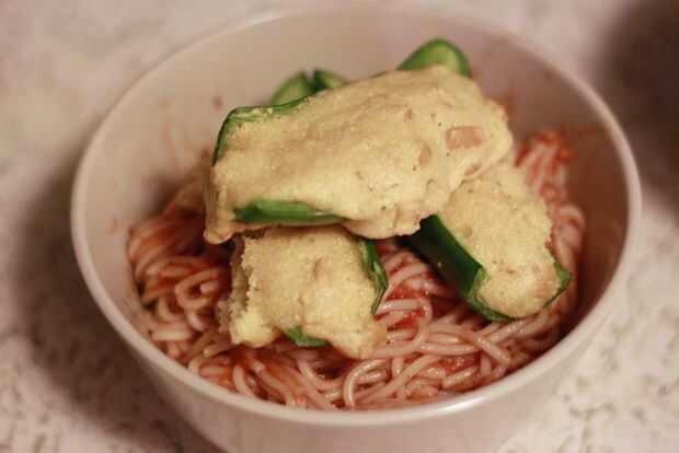Llevarlos a cabo cuando las tapas son un poco crujiente y de color oro. Servimos con unos espaguetis! Yum. Eran tan buenos!