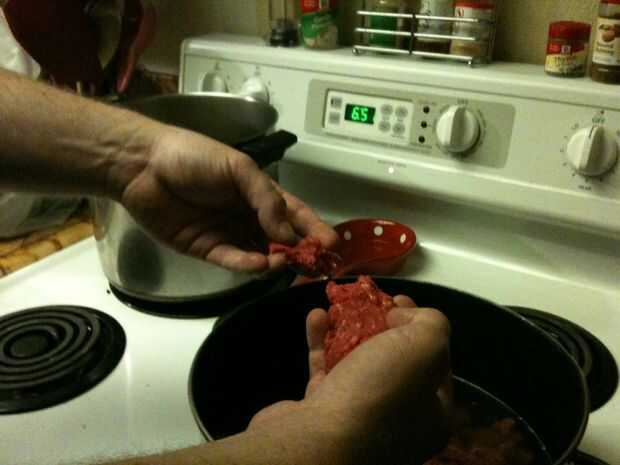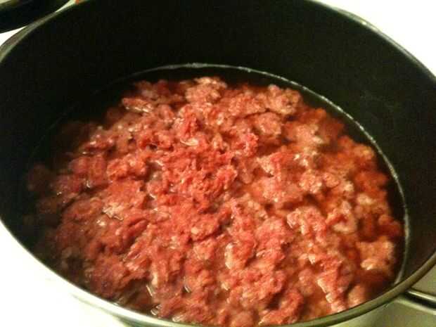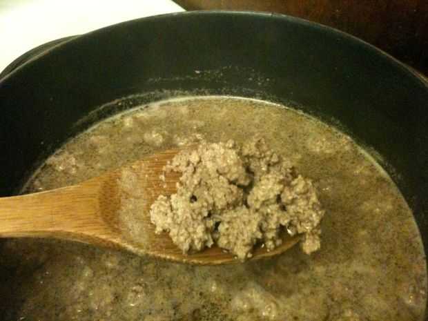 -Sitúe la estufa en medio y comenzar a añadir la carne de vacuno. La mejor manera de hacer esto manteniendo consistencia es agarrar un hanfull pequeñas de carne, sacar pequeños trozos y añadir al agua/caldo.