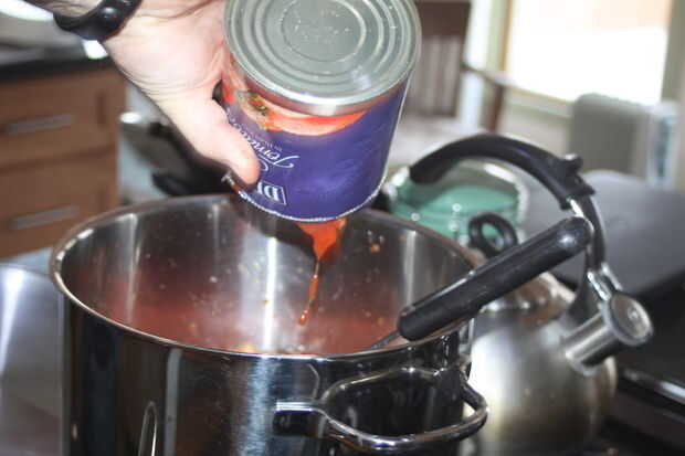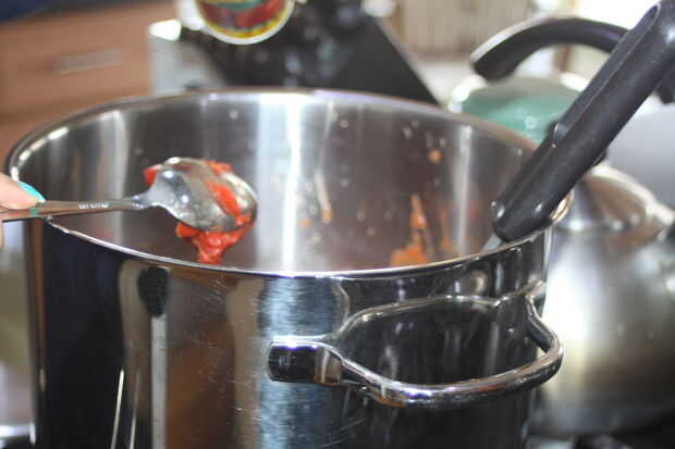 • Añadir la salsa de tomate y pasta a la guindilla. Puede utilizar una cuchara para obtener todo el contenido de los contenedores, si es necesario.