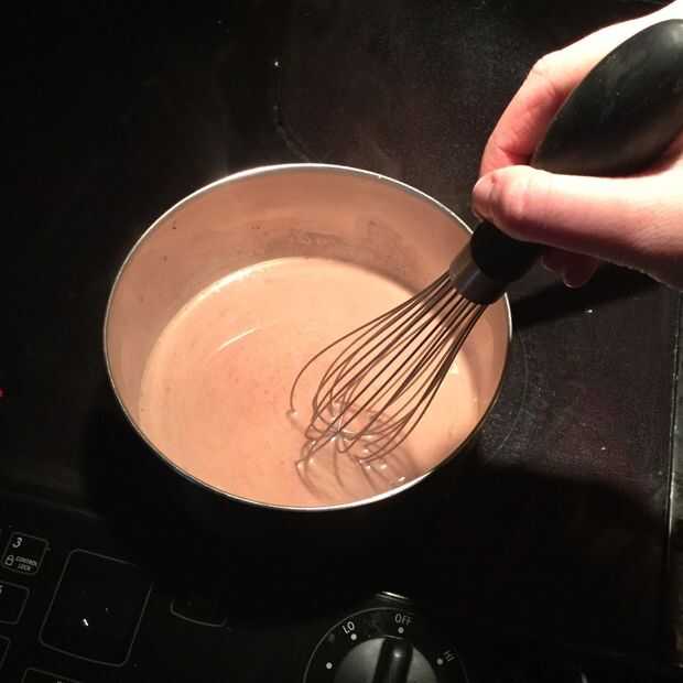 Cuando el chocolate se derrita totalmente, poner en una cocina causa guante el tazón de fuente caliente y verter chocolate en la leche que hervir en la estufa. Mezclar el chocolate derretido y la leche con un batidor hasta que esté completamente mezclado.