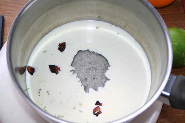 Ahora, hervir la crema de látigo, la glucosa, el anís de China, los pimientos blanco machacados y la escofina de la cal.