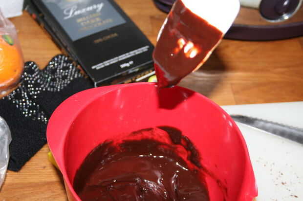 Ejecutar a través de la crema hervida látigo el colador sobre el chocolate. Revuélvalo hasta obtener una consistencia como en la foto.