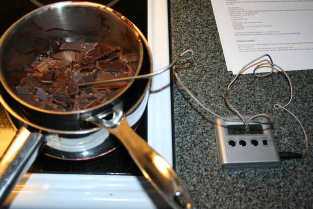 El secreto para conseguir un buen resultado final es para templar el chocolate. Templando el chocolate hará que no se derrita a temperatura ambiente y hará que la estancia de grasa en el chocolate en lugar de mostrar en el exterior.