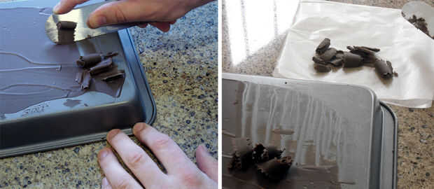 Suavemente aplique presión para hornear y utilizar movimientos fluidos suaves para crear rizos de chocolate. No todos rascados producen rizos perfectos, paciencia es la clave. Cualquier rizos no deseados pueden ser colocados en bain-maire para refundición.